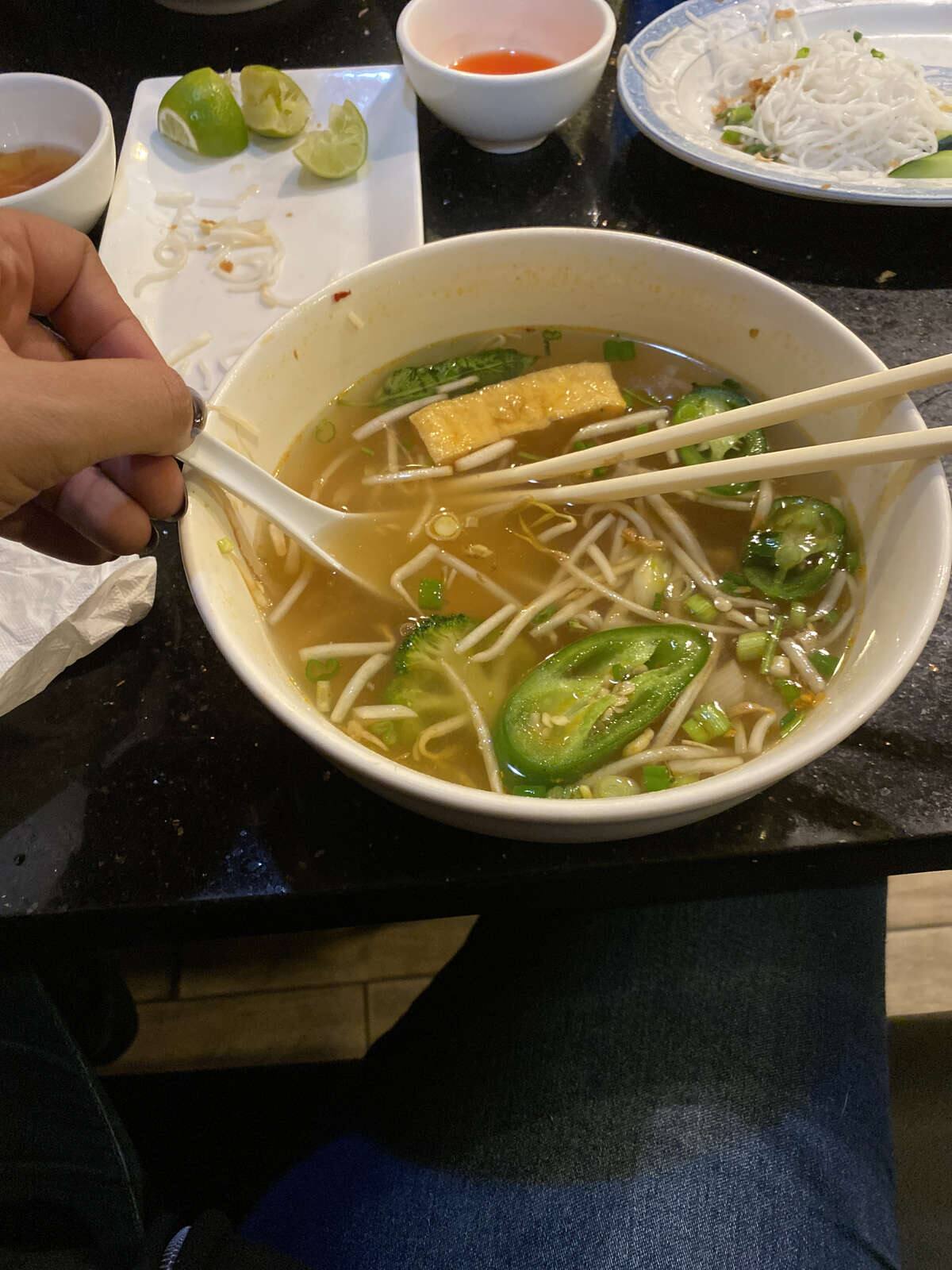 The pho soup is delicious and reasonably priced. And the broth for the seafood pho is. 1617 California St Unit B.